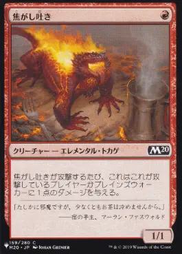 | カードテキスト | 焦がし吐きが攻撃するたび、これはこれが攻撃しているプレイヤーかプレインズウォーカーに1点のダメージを与える。 |
