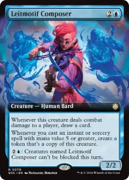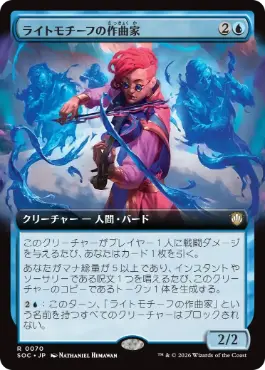 このクリーチャーがプレイヤー1人に戦闘ダメージを与えるたび、あなたはカード1枚を引く。 あなたがマナ総量が5以上であり、インスタントやソーサリーである呪文1つを唱えるたび、このクリーチャーのコピーであるトークン1体を生成する。 {2U}:このターン、「ライトモチーフの作曲家」という名前を持つすべてのクリーチャーはブロックされない。 |