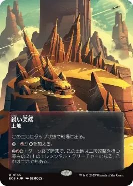 鋭い突端はタップ状態で戦場に出る。 {Tap}:{Red}か{White}を加える。 {2}{Red}{White}:ターン終了時まで、鋭い突端は二段攻撃を持る赤白の2/1のエレメンタル・クリーチャーになる。これは土地でもある。 |