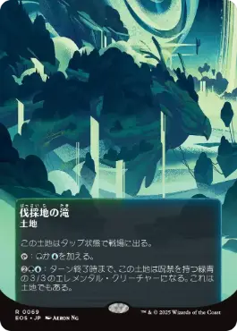 伐採地の滝はタップ状態で戦場に出る。 {Tap}:{Green}か{Blue}を加える。 {2}{Green}{Blue}:ターン終了時まで、伐採地の滝は呪禁を持つ緑青の3/3のエレメンタル・クリーチャーになる。これは土地でもある。 |