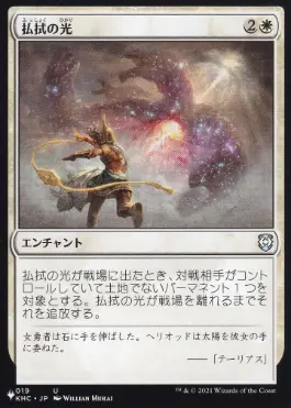 | カードテキスト | 払拭の光が戦場に出たとき、対戦相手がコントロールしていて土地でないパーマネント1つを対象とする。払拭の光が戦場を離れるまで、それを追放する。 |