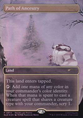祖先の道はタップ状態で戦場に出る。 {Tap}:あなたの統率者の固有色1色のマナ1点を加える。そのマナが、あなたの統率者と共通のクリーチャー・タイプを持つクリーチャー・呪文を唱えるために支払われたとき、占術1を行う。(あなたのライブラリーの一番上にあるカード1枚を見る。そのカードをあなたのライブラリーの一番下に置いてもよい。) |