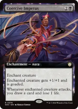 エンチャント(クリーチャー) エンチャントしているクリーチャーは+1/+1の修整を受け、使嗾されている。(それは各戦闘で可能なら攻撃し、可能ならあなたでないプレイヤーを攻撃する。) エンチャントしているクリーチャーが攻撃するたび、あなたはカード1枚を引き、1点のライフを失う。 |