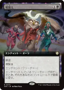 瞬速 複製{2}(あなたがこの呪文を唱えたとき、あなたが複製コストを支払った回数と同じ回数、これをコピーする。それらのコピーの新しい対象を選んでもよい。コピーはトークンになる。) エンチャント(クリーチャー) エンチャントしているクリーチャーが死亡したとき、それをあなたのコントロール下で戦場に戻す。 |