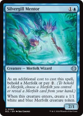 この呪文を唱えるための追加コストとして、マーフォークの後見を受けるか{2}を支払う。(マーフォークの後見を受けるとは、あなたがコントロールしているマーフォーク1体を選ぶか、あなたの手札にあるマーフォーク・カード1枚を公開することである。) このクリーチャーが戦場に出たとき、白青の1/1のマーフォーク・クリーチャー・トークン1体を生成する。 |