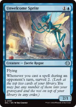 飛行 対戦相手のターン中にあなたが呪文1つを唱えるたび、諜報2を行う。(あなたのライブラリーの一番上にあるカード2枚を見る。そのうちの望む枚数をあなたの墓地に、残りをあなたのライブラリーの一番上に望む順番で置いてもよい。) |