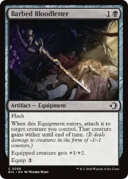 瞬速 この装備品が戦場に出たとき、あなたがコントロールしているクリーチャー1体を対象とする。これをそれにつける。ターン終了時まで、そのクリーチャーは萎縮を得る。(これはクリーチャーに-1/-1カウンターの形でダメージを与える。) 装備しているクリーチャーは+1/+2の修整を受ける。 装備{2} |