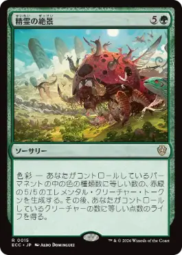 | カードテキスト | 色彩 - あなたがコントロールしているパーマネントの中の色の種類数に等しい数の、赤緑の5/5のエレメンタル・クリーチャー・トークンを生成する。その後、あなたがコントロールしているクリーチャーの数に等しい点数のライフを得る。 |