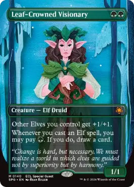 あなたがコントロールしていてこれでないすべてのエルフは+1/+1の修整を受ける。 あなたがエルフ・呪文を唱えるたび、あなたは{Green}を支払ってもよい。そうしたなら、カード1枚を引く。 |