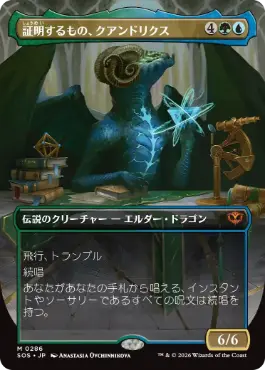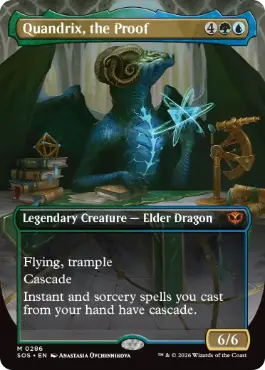 飛行、トランプル 続唱(あなたがこの呪文を唱えたとき、コストがこれより低く土地でないカード1枚が追放されるまで、あなたのライブラリーの一番上から1枚ずつ追放していく。それをマナ・コストを支払うことなく唱えてもよい。それらの追放したカードを、無作為の順番で一番下に置く。) あなたがあなたの手札から唱える、インスタントやソーサリーであるすべての呪文は続唱を持つ。 |