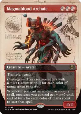 トランプル、到達 収斂 ― このクリーチャーは、これを唱えるために支払われたマナの色1種類につき1個の+1/+1カウンターが置かれた状態で戦場に出る。 あなたがインスタントやソーサリーである呪文1つを唱えるたび、ターン終了時まで、あなたがコントロールしているすべてのクリーチャーは、その呪文を唱えるために支払われたマナの色1種類につき+1/+0の修整を受ける。 |