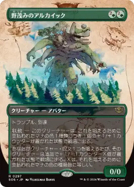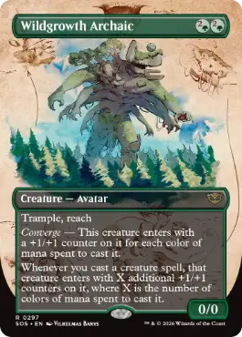 トランプル、到達 収斂 ― このクリーチャーは、これを唱えるために支払われたマナの色1種類につき1個の+1/+1カウンターが置かれた状態で戦場に出る。 あなたがクリーチャー・呪文1つを唱えるたび、そのクリーチャーは追加で+1/+1カウンターX個が置かれた状態で戦場に出る。Xは、それを唱えるために支払われたマナの色の種類数に等しい。 |
