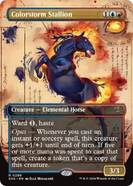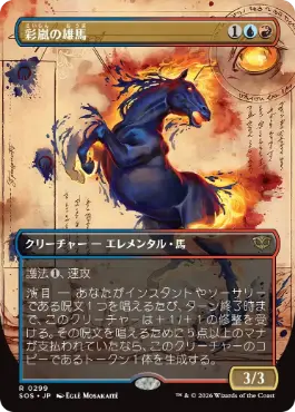 護法{1}、速攻 演目 ― あなたがインスタントやソーサリーである呪文1つを唱えるたび、ターン終了時まで、このクリーチャーは+1/+1の修整を受ける。その呪文を唱えるために5点以上のマナが支払われていたなら、このクリーチャーのコピーであるトークン1体を生成する。 |