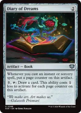 あなたがインスタントやソーサリーである呪文1つを唱えるたび、このアーティファクトの上にページ・カウンター1個を置く。 {5}, {T}:カード1枚を引く。この能力を起動するためのコストは、このアーティファクトの上にあるページ・カウンター1個につき{1}少なくなる。 |