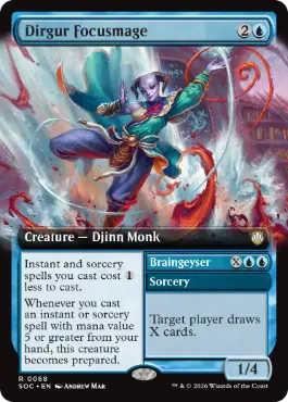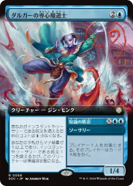 あなたがインスタントやソーサリーである呪文を唱えるためのコストは{1}少なくなる。 あなたの手札からマナ総量が5以上であり、インスタントやソーサリーである呪文1つを唱えるたび、このクリーチャーは準備済状態になる。 |
