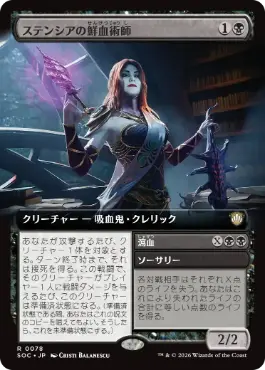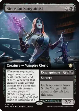 | カードテキスト | あなたが攻撃するたび、クリーチャー1体を対象とする。ターン終了時まで、それは接死を得る。この戦闘で、そのクリーチャーがプレイヤー1人に戦闘ダメージを与えるたび、このクリーチャーは準備済状態になる。(準備済状態である間、あなたはこれの呪文のコピーを唱えてもよい。そうしたら、これを未準備状態にする。) |