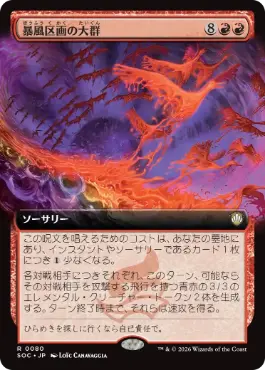 この呪文を唱えるためのコストは、あなたの墓地にあり、インスタントやソーサリーであるカード1枚につき{1}少なくなる。 各対戦相手につきそれぞれ、このターン、可能ならその対戦相手を攻撃する飛行を持つ青赤の3/3のエレメンタル・クリーチャー・トークン2体を生成する。ターン終了時まで、それらは速攻を得る。 |