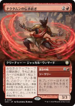 | カードテキスト | あなたのアップキープの開始時に、手札にあるカードの枚数が1枚以下のプレイヤーがいる場合、このクリーチャーは準備済状態になる。(準備済状態である間、あなたはこれの呪文のコピーを唱えてもよい。そうしたら、これを未準備状態にする。) |