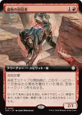 先制攻撃 各終了ステップの開始時に、このターンにカードがあなたの墓地を離れていた場合、宝物・トークン1つを生成する。(それは「{T}, このトークンを生け贄に捧げる:好きな色1色のマナ1点を加える。」を持つアーティファクトである。) |