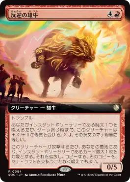 トランプル あなたがインスタントやソーサリーである呪文1つを唱えるたび、ターン終了時まで、このクリーチャーは+X/+0の修整を受ける。Xは、その呪文のマナ総量に等しい。 このクリーチャーが攻撃するたび、あなたの墓地にあり、インスタントやソーサリーであるカード最大1枚を対象とする。それを追放し、コピーする。そのコピーを、マナ・コストを支払うことなく唱えてもよい。 |