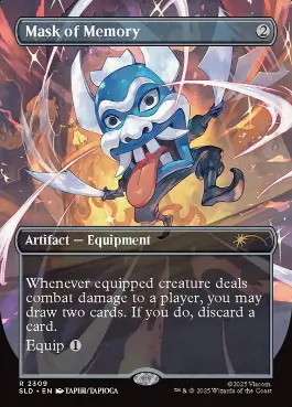 装備しているクリーチャーがプレイヤー1人に戦闘ダメージを与えるたび、あなたはカード2枚を引いてもよい。そうしたなら、カード1枚を捨てる。 装備{1} |