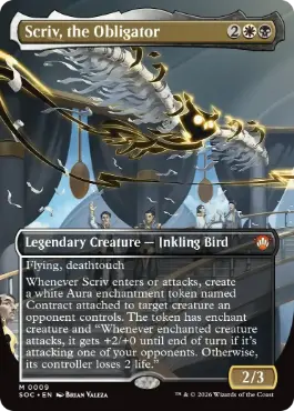 飛行、接死 これが戦場に出るか攻撃するたび、対戦相手がコントロールしているクリーチャー1体を対象とする。「契約」という名前を持つ白のオーラ・エンチャント・トークン1つをそれについた状態で生成する。そのトークンはエンチャント(クリーチャー)と「エンチャントしているクリーチャーが攻撃するたび、それがあなたの対戦相手のうち1人を攻撃しているなら、ターン終了時まで、それは+2/+0の修整を受ける。そうでないなら、それのコントローラーは2点のライフを失う。」を持つ。 |