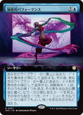 | カードテキスト | あなたのライブラリーの一番上にあるカード4枚を裏向きの束にして追放する。その後、あなたのライブラリーの一番上にあるカード4枚を表向きの束にして追放する。対戦相手1人は、そのうちの束1つを選ぶ。その束をあなたの墓地に置く。もう一方の束にあるカードを見る。その中から呪文1つを、マナ・コストを支払うことなく唱えてもよい。残りをあなたの手札に加える。 |