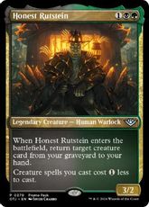 正直者のラトスタインが戦場に出たとき、あなたの墓地にあるクリーチャー・カード1枚を対象とする。それをあなたの手札に戻す。 あなたがクリーチャー・呪文を唱えるためのコストは{1}少なくなる。 |