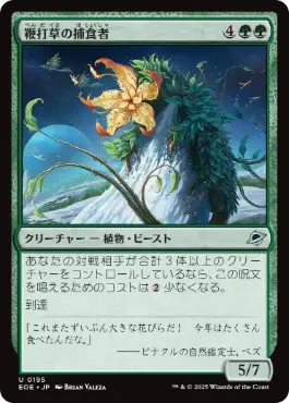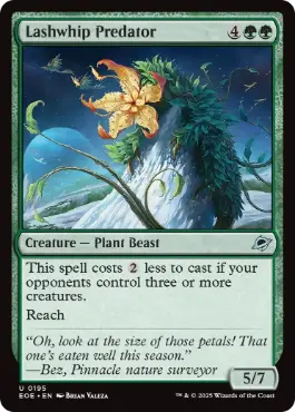 あなたの対戦相手が合計3体以上のクリーチャーをコントロールしているなら、この呪文を唱えるためのコストは{2}少なくなる。 到達 |