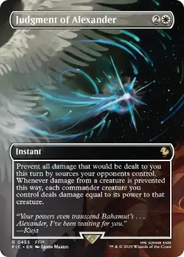 | カードテキスト | このターン、対戦相手がコントロールしている発生源からあなたが受けるすべてのダメージを軽減する。これによりクリーチャーからのダメージが軽減されるたび、あなたがコントロールしていて統率者である各クリーチャーはそれぞれ自身のパワーに等しい点数のダメージをそのクリーチャーに与える。 |