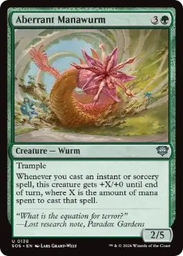 トランプル あなたがインスタントやソーサリーである呪文1つを唱えるたび、ターン終了時まで、このクリーチャーは+X/+0の修整を受ける。Xは、その呪文を唱えるために支払われたマナの点数に等しい。 |