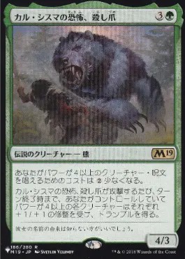あなたがパワーが4以上であるクリーチャー・呪文を唱えるためのコストは{2}少なくなる。 カル・シスマの恐怖、殺し爪が攻撃するたび、ターン終了時まで、あなたがコントロールしていてパワーが4以上であるすべてのクリーチャーは+1/+1の修整を受けトランプルを得る。 |
