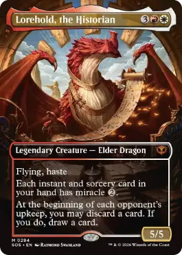 飛行、速攻 あなたの手札にあり、インスタントやソーサリーであるすべてのカードは奇跡{2}を持つ。(あなたがこのターンに最初に引いたカードとして奇跡を持つカードを引き、すぐに公開したとき、それの奇跡コストを支払ってそのカードを唱えてもよい。) 各対戦相手のアップキープの開始時に、あなたはカード1枚を捨ててもよい。そうしたなら、カード1枚を引く。 |