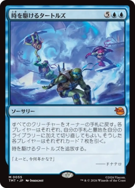 すべてのクリーチャーをオーナーの手札に戻す。各プレイヤーはそれぞれ、自分の手札と墓地を自分のライブラリーに加えて切り直してもよい。そうした各プレイヤーはそれぞれカード7枚を引く。 時を駆けるタートルズを追放する。 |