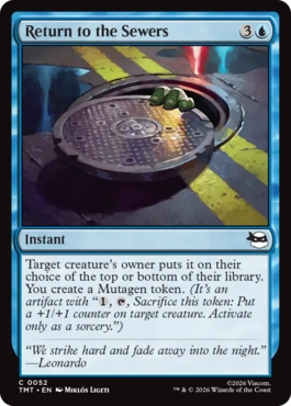 | カードテキスト | クリーチャー1体を対象とする。それのオーナーはそれを自分のライブラリーの一番上か一番下に置く。あなたはミュータンジェン・トークン1つを生成する。(それは、「{1}, {T}, このトークンを生け贄に捧げる:クリーチャー1体を対象とする。それの上に+1/+1カウンター1個を置く。起動はソーサリーとしてのみ行う。」を持つアーティファクトである。) |