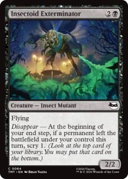 飛行 離脱 ― あなたの終了ステップの開始時に、このターンにパーマネントがあなたのコントロール下で戦場を離れていた場合、占術1を行う。(あなたのライブラリーの一番上にあるカード1枚を見る。それをあなたのライブラリーの一番下に置いてもよい。) |