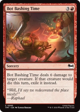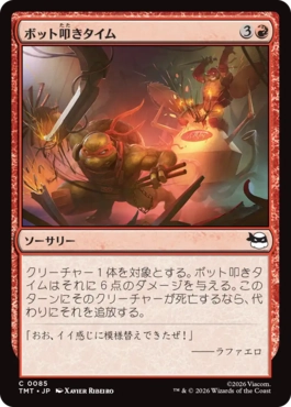 | カードテキスト | クリーチャー1体を対象とする。ボット叩きタイムはそれに6点のダメージを与える。このターンにそのクリーチャーが死亡するなら、代わりにそれを追放する。 |