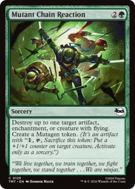 | カードテキスト | アーティファクト、エンチャント、または飛行を持つクリーチャーである最大1つを対象とする。それを破壊する。ミュータンジェン・トークン1つを生成する。(それは、「{1}, {T}, このトークンを生け贄に捧げる:クリーチャー1体を対象とする。それの上に+1/+1カウンター1個を置く。起動はソーサリーとしてのみ行う。」を持つアーティファクトである。) |