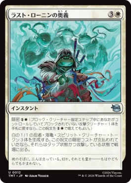 隠密{1W}(ブロック・クリーチャー指定ステップ中にあなたがコントロールしていてブロックされていない攻撃クリーチャー1体を手札に戻すなら、この呪文を{1W}で唱えてもよい。) 白の1/1の忍者・海亀・スピリット・クリーチャー・トークン3体を生成する。この呪文の隠密コストが支払われていたなら、それらはタップ状態かつ攻撃している状態で戦場に出る。 |