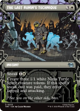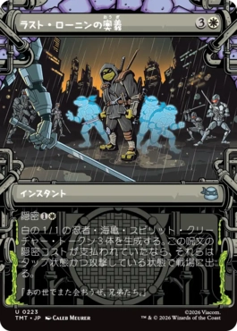 隠密{1W}(ブロック・クリーチャー指定ステップ中にあなたがコントロールしていてブロックされていない攻撃クリーチャー1体を手札に戻すなら、この呪文を{1W}で唱えてもよい。) 白の1/1の忍者・海亀・スピリット・クリーチャー・トークン3体を生成する。この呪文の隠密コストが支払われていたなら、それらはタップ状態かつ攻撃している状態で戦場に出る。 |
