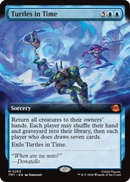 すべてのクリーチャーをオーナーの手札に戻す。各プレイヤーはそれぞれ、自分の手札と墓地を自分のライブラリーに加えて切り直してもよい。そうした各プレイヤーはそれぞれカード7枚を引く。 時を駆けるタートルズを追放する。 |