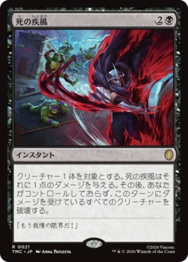 | カードテキスト | クリーチャー1体を対象とする。死の疾風はそれに1点のダメージを与える。その後、あなたがコントロールしておらず、このターンにダメージを受けているすべてのクリーチャーを破壊する。 |