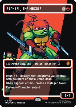 あなたがコントロールしていてカウンターが置かれているクリーチャーが与えるすべてのダメージを2倍にする。 これが戦場に出たとき、ミュータンジェン・トークン1つを生成する。 共闘 ― キャラ選択(両方がこの能力を持つなら、あなたは統率者2体を使用できる。) |