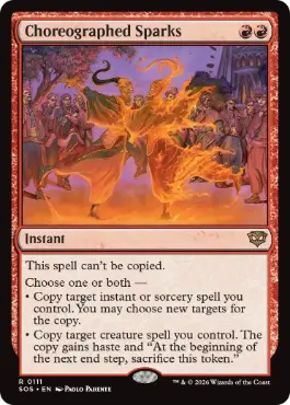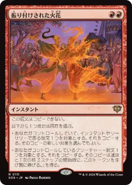 この呪文はコピーできない。 以下から1つまたは両方を選ぶ。 ・あなたがコントロールしていて、インスタントやソーサリーである呪文1つを対象とする。それをコピーする。そのコピーの新しい対象を選んでもよい。 ・あなたがコントロールしているクリーチャー・呪文1つを対象とする。それをコピーする。そのコピーは速攻と「次の終了ステップの開始時に、このトークンを生け贄に捧げる。」を得る。 |