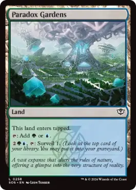 この土地はタップ状態で戦場に出る。 {T}:{G}か{U}を加える。 {2GU}, {T}:諜報1を行う。(あなたのライブラリーの一番上にあるカード1枚を見る。それをあなたの墓地に置いてもよい。) |