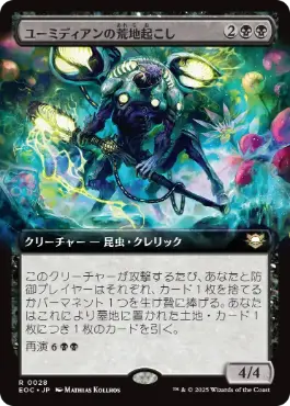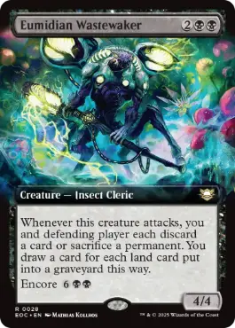 このクリーチャーが攻撃するたび、あなたと防御プレイヤーはそれぞれ、カード1枚を捨てるかパーマネント1つを生け贄に捧げる。あなたはこれにより墓地に置かれた土地・カード1枚につき1枚のカードを引く。 再演{6}{B}{B}{B}{B}({6}{B}{B}{B}{B},あなたの墓地にあるこのカードを追放する:各対戦相手につきそれぞれ、このカードのコピーであるトークン1体であり、このターン可能ならそのプレイヤーを攻撃するトークン1体を生成する。それらは速攻を得る。次の終了ステップの開始時に、それらを生け贄に捧げる。起動はソーサリーとしてのみ行う。) |