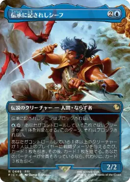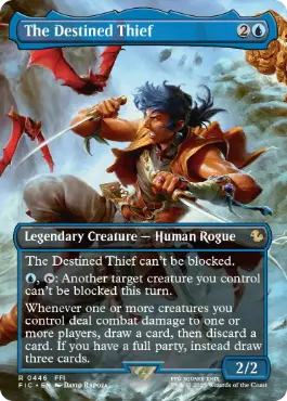 伝承に記されしシーフはブロックされない。 {U},{T}: あなたがコントロールしていてこれでないクリーチャー1体を対象とする。このターン、それはブロックされない。 あなたがコントロールしている1体以上のクリーチャーが1人以上のプレイヤーに戦闘ダメージを与えるたび、 カード1枚を引き、その後、カード1枚を捨てる。あなたのパーティーが全員そろっているなら、代わりに、カード 3枚を引く。 |