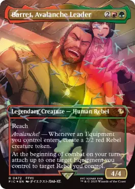 到達 アバランチ ― あなたがコントロールしている装備品1つが戦場に出るたび、赤の2/2のレベル・クリーチャー・トークン1体を生成する。 あなたのターンの戦闘の開始時に、あなたがコントロールしている装備品最大1つを対象とし、あなたがコントロールしているレベル1体を対象とする。その前者をその後者につける。 |