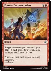 カードテキスト クリーチャー1体を対象とする。カード1枚を引く。ターン終了時まで、そのクリーチャーはトランプルを得、このターンにあなたが引いたカード1枚につき+1/+0の修整を受ける。