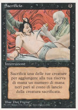 Sacrificeを唱えるための追加コストとして、クリーチャーを1体生け贄に捧げる。 あなたのマナ・プールに、生け贄に捧げられたクリーチャーの点数で見たマナ・コストに等しい量の(黒)を加える。 |